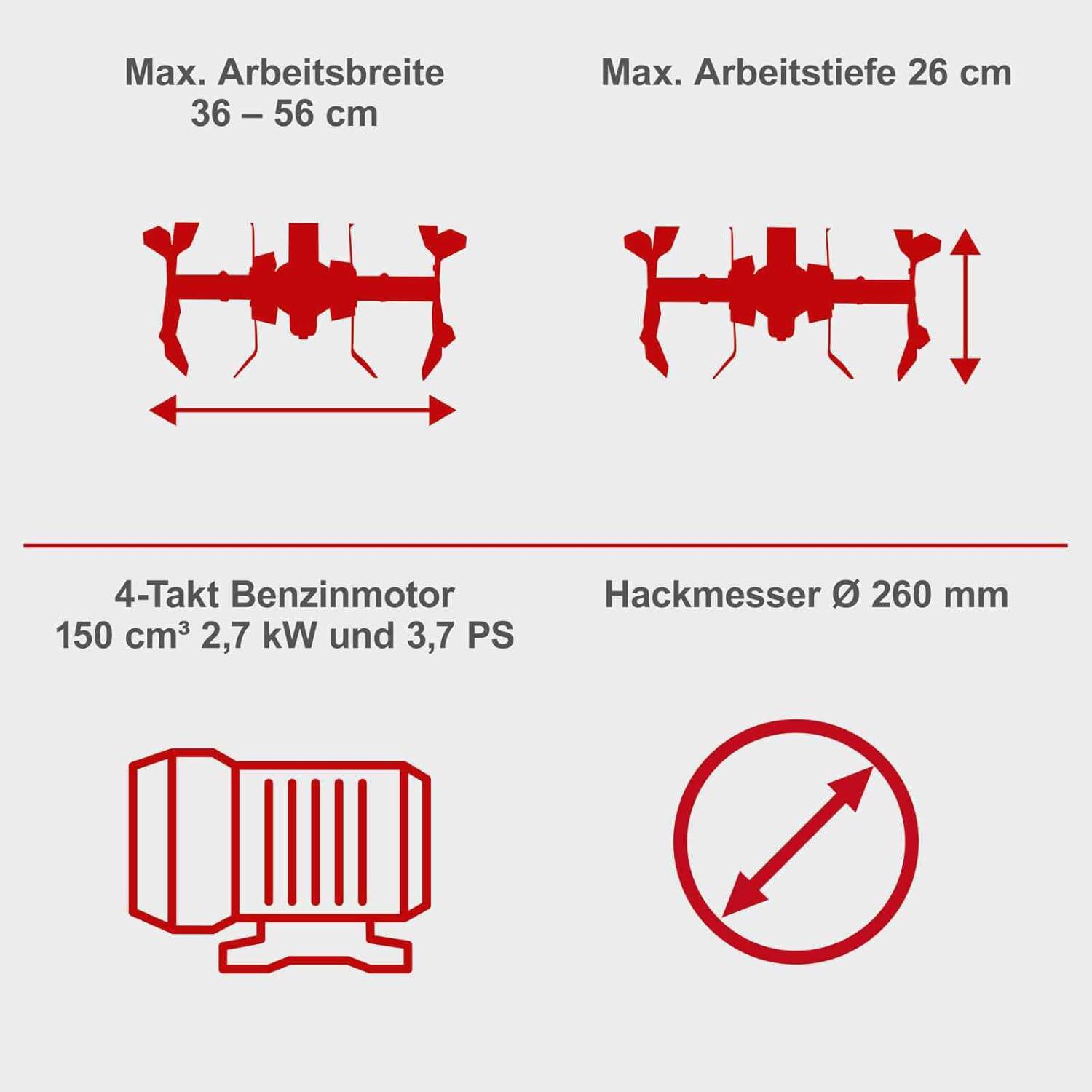 Scheppach MTP 560 benzinska freza idealan je pratitelj za učinkovitu pripremu tla prije sadnje, rahljenje tla, rahljenje tla nakon kopanja i unošenje gnojiva, komposta ili drugih hranjivih tvari u tlo. Njegov kompaktan dizajn i jednostavno rukovanje čine ga savršenim za hobi vrtlare koji rade na malim do srednje velikim površinama. Pouzdane performanse osigurava motor od 2,7 kW (3,7 KS) i mjenjač izrađen od visokokvalitetne aluminijske legure. Stroj je opremljen s 24 zupca promjera 260 mm, koji imaju bočnu zaštitu za zaštitu i rukovatelja i biljaka. Radna širina od 560 mm (ili 36 cm s uklonjenim vanjskim zupcima) omogućuje brzu obradu većih površina, dok podesiva radna dubina do 26 cm pruža potpunu kontrolu nad rezultatom. Udoban rad osigurava ergonomska ručka i kruta konstrukcija s niskim vibracijama. Tu su i praktični transportni kotači za jednostavno premještanje. Scheppach MTP 560 stoga nudi idealnu kombinaciju snage, udobnosti i učinkovitosti za svakodnevne vrtne radove.